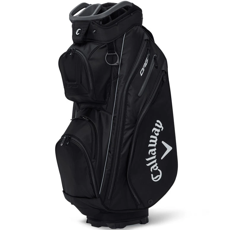 Callaway Org 14 Cart Bag The Callaway Org 14 Golf Cart Bag has been designed to provide golfers with golf club bag that features a 14-way top while still having plenty of storage space while on the golf course.& Callaway has created this cart bag to feature a 14-way top to allow golfers to experience the incredible organisation of the golf clubs by slotting each club into their own compartment for easier access while out on the golf course. This top design also features full-length dividers for each golf club slot for additional protection for golf clubs that have graphite shafts to stop the clubs from colliding with each other while travelling across the golf course. To ensure that this golf bag is easy to load on and off of golf trolleys, Callaway has constructed the entire bag to only weigh 2.7kgs. This lightweight design, paired with the two integrated grab handles, makes this golf cart bag very easy to use while the new E trolley base allows for secure loading onto electric golf trolleys too. This golf club bag has been designed to make sure that when out on the golf course players have plenty of storage space to bring everything they need to play a great round of golf with them. This has been achieved by including 11 pockets into the design of this golf bag which include a compartment for golf balls, a thermal-lined cooler pocket for keeping drinks cool during warmer days on the golf course, a moulded range finder/GPS pocket and two full-length clothing pockets that are perfect for storing golfing waterproofs, waterproof trousers, jackets and jumpers. Features 10.5 inch diameter top 14-way top 14 individual full length dividers Separate TPE putter well 2 integrated grab handles Comfort single strap 11 pockets in total Velour lined valuables pockets 2 full length apparel pockets Ball pockets Molded front Range finder/GPS pocket Thermal lined cooler pocket Accessory pockets New E trolley base Integrated umbrella holder Integrated putter section Rain hood included Towel hook Glove attachment Weight of 2.7KG