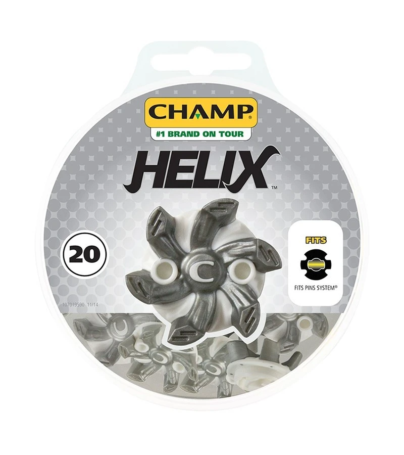Champ Helix Cleat pack Don’t let your cleats wear out! The Champ helix cleats help to provide better traction and grip to ensure you play at your best. Non – clogging Soft durometer TPU Superior comfort and durability C visible wear indicator Green friendly design minimises marks on the green Wrench holes formed in rigid material Spring-flex traction for optimum grip 20 per pack- Non – clogging Soft durometer TPU Superior comfort and durability C visible wear indicator Green friendly design minimises marks on the green Wrench holes formed in rigid material Spring-flex traction for optimum grip 20 per pack