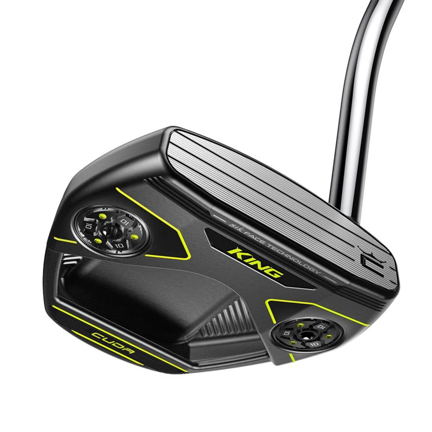 Cobra KING CUDA Single Bend Golf Putter The KING CUDA Single Bend Golf Putter has been designed by Cobra to allow golfers to experience a golf club that offers incredible stability and feel while offering unmatched roll consistency.& Cobra has designed this golf club using an oversized mallet shaped clubhead that has been constructed using stainless steel while also featuring an alignment sightline so that when at the address of a golf ball golfers will have much more confidence in where they are aiming for increased accuracy.& To ensure that golfers are able to putt with the highest amount of accuracy possible Cobra has worked with SIK Golf to create an aluminium face insert that uses Descending Loft Technology (DLT). This technology uses four descending lofts on the face to provide the most consistent roll and launch angle on a variety of putting strokes for increased performance for every golfer that uses this golf club.& This golf putter has been designed to include two 10g sole weights to allow golfers to play with a golf club that has increased feel and stability. To allow golfers to have a golf putter that is suited to their putting style these weights can be adjusted to either be heavier or lighter to be best suited to you. The KING CUDA golf putter has been constructed with a single bend hosel which is perfect for golfers who play with a putting style that is straighter. Features Oversize Mallet Shape An oversized mallet shape is constructed using 304 stainless steel and features a single sightline for improved alignment at address. SIK Aluminium Face Insert An aluminium face insert features SIK Golf’s proprietary Descending Loft Technology (DLT) for an excellent feel and straighter and more accurate putts. Adjustable Weighting The Cuda putter comes with two 10g sole weights that can be adjusted up to +15g or -5g each (adjusting head weight from +30g to -10g) using heavier weights (5g, 15g, 20g, 25g) to dial in feel and stability. Weights are sold separately. &