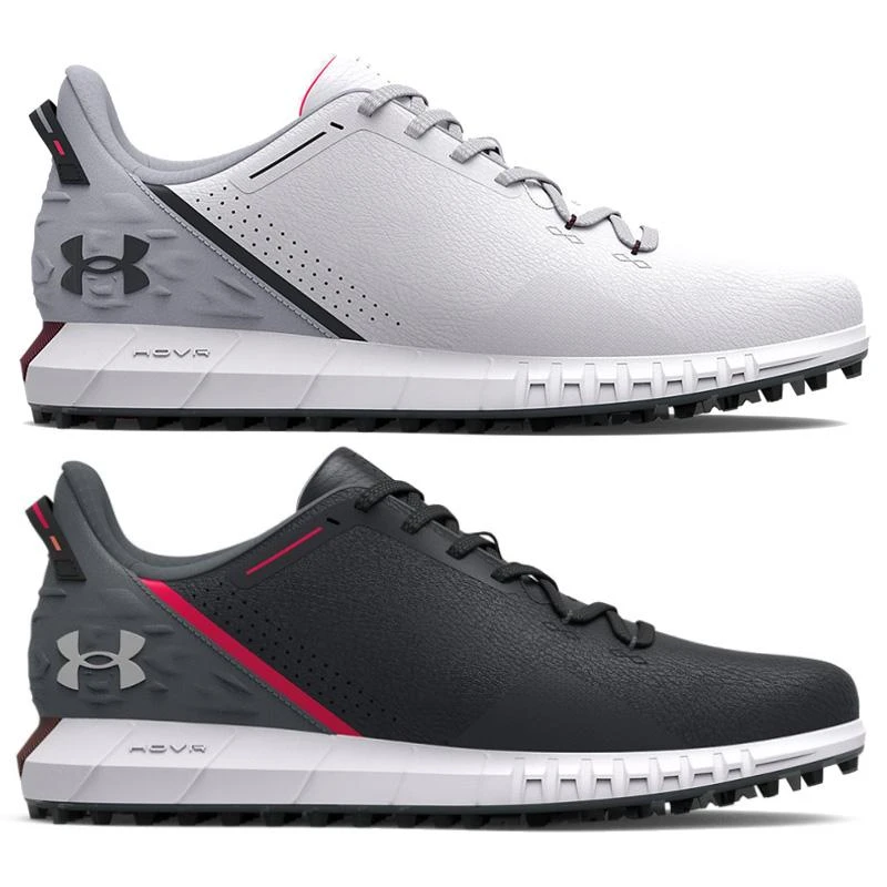 Under Armour HOVR Drive SL Wide Golf Shoes – White The key here is the UA HOVR cushioning—it’s not just comfortable, it actually returns energy. Add in waterproof, breathable technology and you’re ready to go all season. Features: Breathable, supportive engineered microfiber upper & lightweight waterproof membrane keep you cool & dry Molded heel is anatomically designed to improve support & fit Molded EVA footbed provides supportive step-in comfort UA HOVR™ placement supports the natural motion of the foot in a golf swing & helps eliminate impact UA Rotational Resistance outsole for lightweight lockdown traction to support your swing TPU spikeless outsole for a lighter, more flexible feel without any compromise in traction 1 year waterproof warranty Weight: 12.2 oz. Lace type: Standard tie E Sizing built to better fit athletes with wide feet